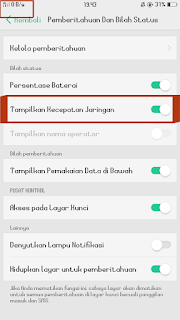 Kemudian geser kekanan aktifkan tampilkan kecepatan jaringan sebelumnya tidak muncul ikon kecepatan dengan mengaktifkan maka sekarang anda bisa melihat kecepatan jaringan internet nilai angka mbs/kbs di status bar, seberapa cepat kecepatan saat anda berinternetan.